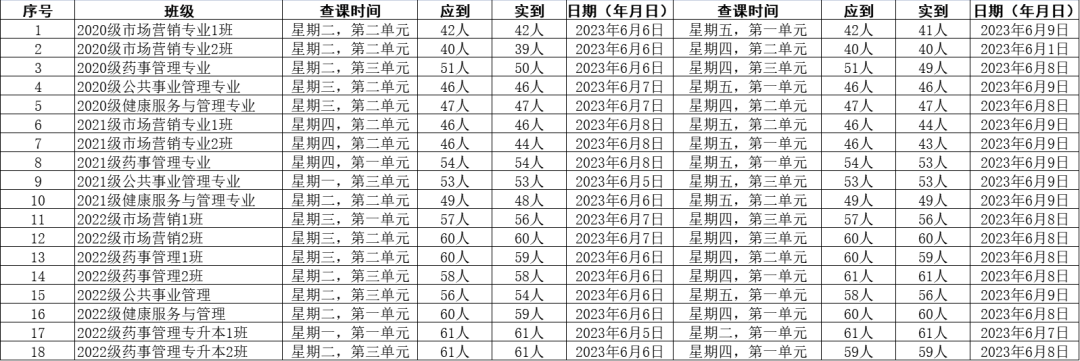为全面推进本科教育水平评估工作,KY开元集团官网党委积极组织学生党员开展查课工作,于6月11日,对第十四周的查课情况做出总结。本周查课以严谨认真的态度对迟到、旷课、带早餐的学生进行了督促和教育。学生党员进入每间教室内检查学生出勤情况。经过一周的督查,学院共查18个班级36节课,覆盖学院全体20级、21级、22级及22级专升本共952名学生。现查课通报如下:
