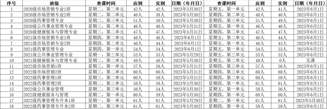 为全面推进本科教育水平评估工作,KY开元集团官网党委积极组织学生党员开展查课工作,于6月3日,对第十三周的查课情况做出总结。本周查课以严谨认真的态度对迟到、旷课、带早餐的学生进行了督促和教育。学生党员进入每间教室内检查学生出勤情况。经过一周的督查,学院共查18个班级36节课,覆盖学院全体20级、21级、22级及22级专升本共952名学生。现查课通报如下: