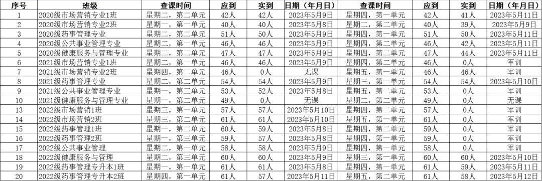 为全面推进本科教育水平评估工作,KY开元集团官网党委积极组织学生党员开展查课工作,于5月14日,对第十周的查课情况做出总结。本周查课以严谨认真的态度对迟到、旷课、带早餐的学生进行了督促和教育。学生党员进入每间教室内检查学生出勤情况。经过一周的督查,学院共查18个班级36节课,覆盖学院全体20级、21级、22级及22级专升本共952名学生。现查课通报如下: