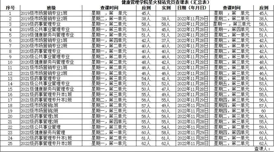 出勤率较好的班级有:2019级市场营销专业1班(出勤率100%)、2019级市场营销专业2班(出勤率100%)、2019级药事管理专业(出勤率100%)、2020级市场营销专业2班(出勤率100%)、2020级药事管理专业(出勤率100%)、2020级公共事业管理专业(出勤率100%)、2022级药事管理1班(出勤率100%)。