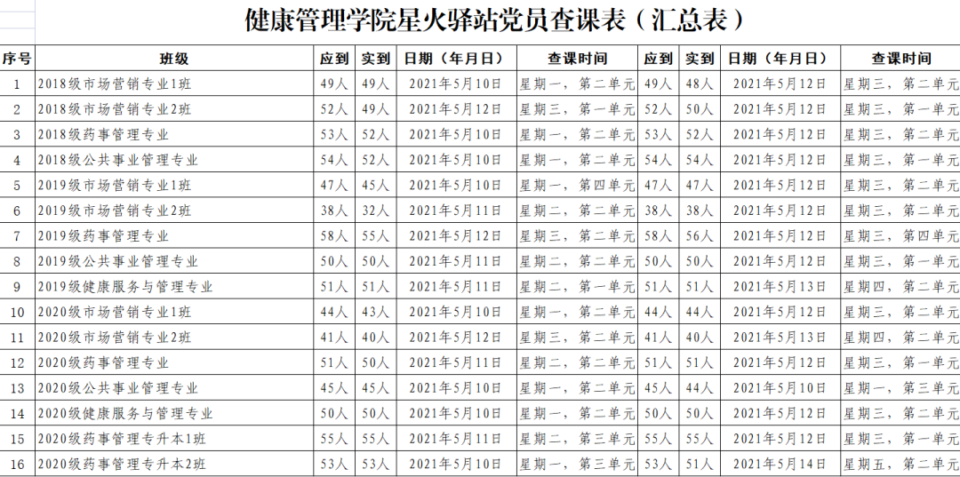出勤情况较好的班级有:2019级健康服务与管理专业(出勤率100%)、2019级公共事业管理专业(出勤率100%)、2020级健康服务与管理专业(出勤率100%)、2020级药事管理专升本1班(出勤率100%)