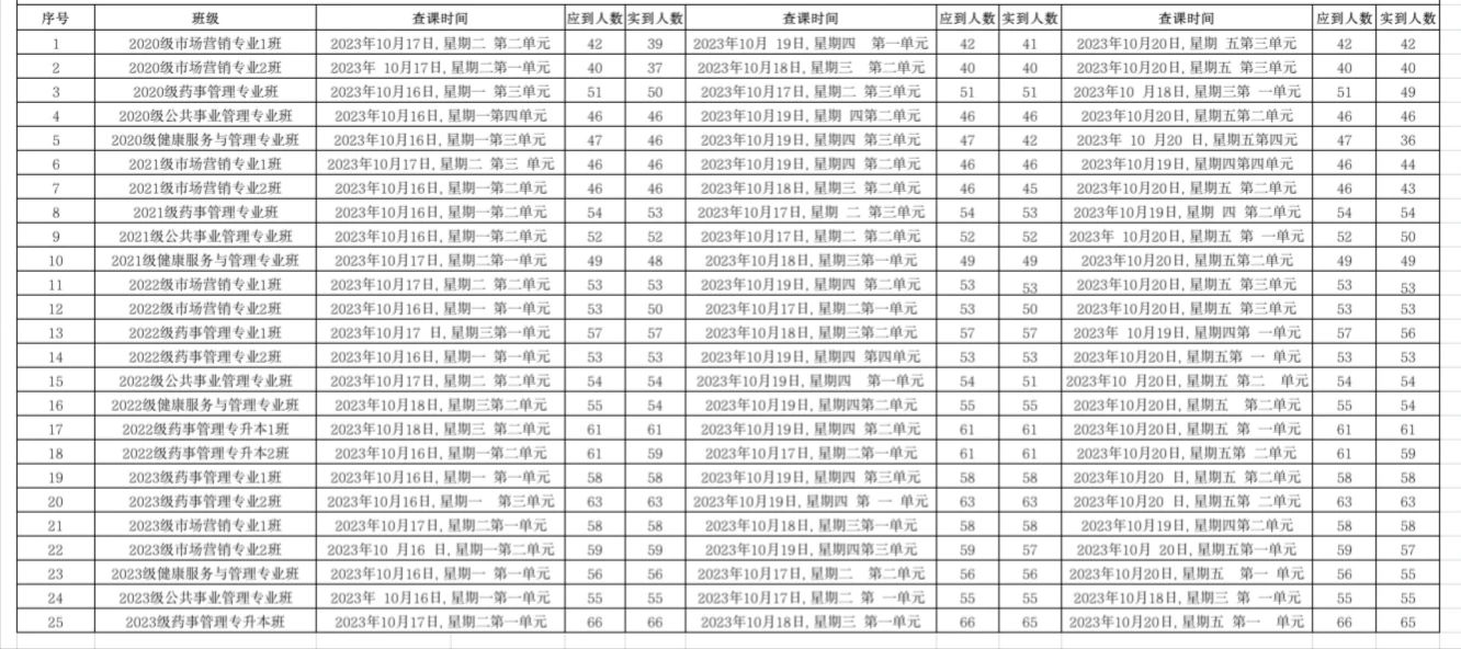 为全面推进本科教育水平评估工作,KY开元集团官网党委积极组织学生党员开展查课工作,于10月22日,对第八周的查课情况做出总结。本周查课以严谨认真的态度对迟到、旷课、带早餐的学生进行了督促和教育。学生党员进入每间教室内检查学生出勤情况。经过一周的督查,学院共查25个班级75节课,覆盖学院全体20级、21级、22级、23级、22级专升本以及23级专升本共1335名学生。现查课通报如下: