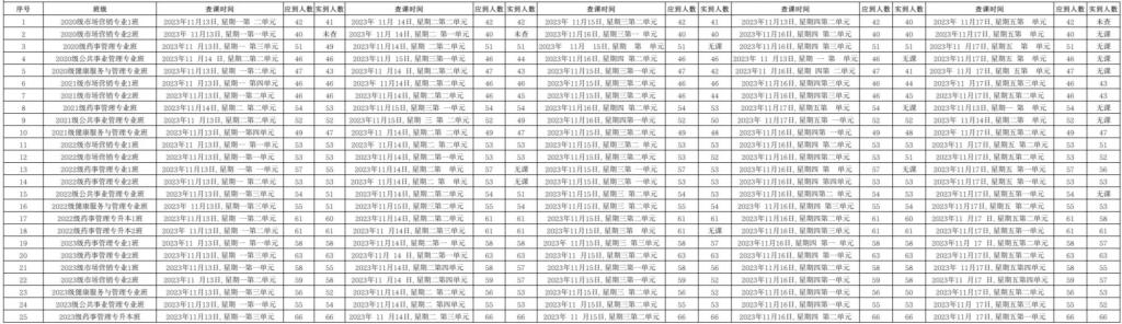 为全面推进本科教育水平评估工作,KY开元集团官网党委积极组织学生党员开展查课工作,于11月19日,对第十二周的查课情况做出总结。本周查课以严谨认真的态度对迟到、旷课、带早餐的学生进行了督促和教育。学生党员进入每间教室内检查学生出勤情况。经过一周的督查,学院共查25个班级125节课,覆盖学院全体20级、21级、22级、23级、22级专升本以及23级专升本共1335名学生。现查课通报如下: