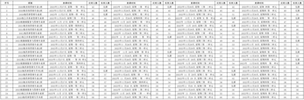 为全面推进本科教育水平评估工作,KY开元集团官网党委积极组织学生党员开展查课工作,于12月2日,对第十四周的查课情况做出总结。本周查课以严谨认真的态度对迟到、旷课、带早餐的学生进行了督促和教育。学生党员进入每间教室内检查学生出勤情况。经过一周的督查,学院共查25个班级100节课,覆盖学院全体20级、21级、22级、23级、22级专升本以及23级专升本共1335名学生。现查课通报如下: