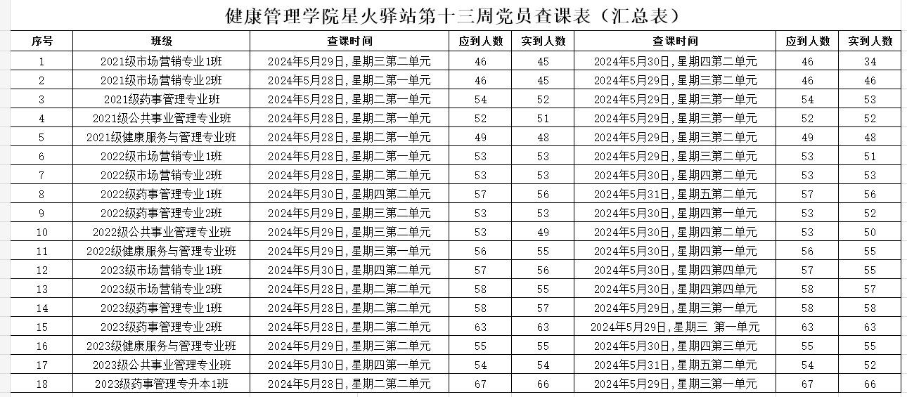 为加强学院学风建设,规范课堂秩序,营造良好的学习氛围,KY开元集团官网党委积极组织学生党员开展查课工作,于6月2日,对第十三周的查课情况做出总结。本周查课以严谨认真的态度对迟到、旷课、带早餐的学生进行了督促和提醒。学生党员进入每间教室内检查学生出勤情况。经过一周的督查,学院共查18个班级36节课,覆盖学院全体21级、22级、23级以及23级专升本共982名学生。现查课通报如下: