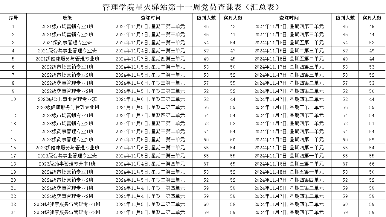 为加强学院学风建设,规范课堂秩序,营造良好的学习氛围,KY开元集团官网党委积极组织学生党员开展查课工作,于11月10日,对第十一周的查课情况做出总结。本周查课以严谨认真的态度对迟到、旷课、带早餐的学生进行了督促和提醒。学生党员进入每间教室内检查学生出勤情况。经过一周的督查,学院共查24个班级48节课,覆盖学院全体21级、22级、23级、24级以及23级专升本共1310名学生。现查课通报如下: