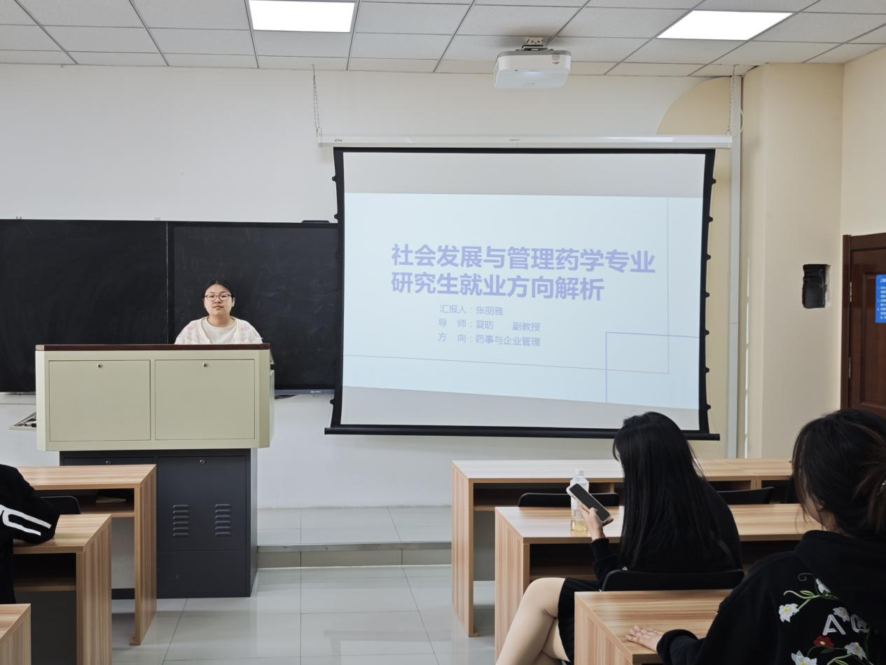 2023级社会发展与管理药学硕士研究生张丽雅同学,以《社会发展与管理药学专业研究生就业方向解析》为主题汇报。围绕学术深造、事业单位、基层服务、高层次就业等方向展开介绍。通过系统阐述,倡议与会同学积极关注国家政策导向及校院就业信息资源,提前规划职业发展路径,为高质量就业夯实基础。
