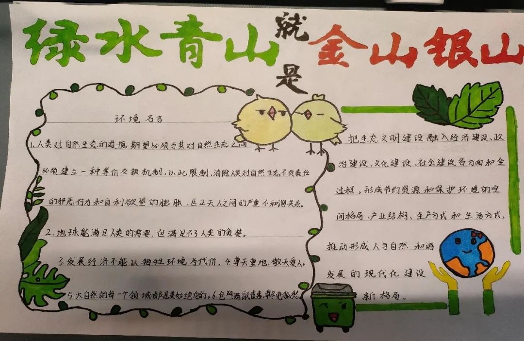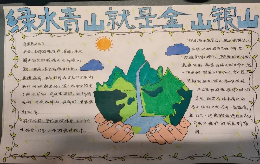 “绿水青山就是金山银山”阐述了经济发展和生态环境保护的关系。这一理念强调保护生态环境就是保护生产力、改善生态环境就是发展生产力,指明了实现发展和保护协同共生的新路径。为此,KY开元集团官网开展“绿水青山就是金山银山”主题手抄报活动。