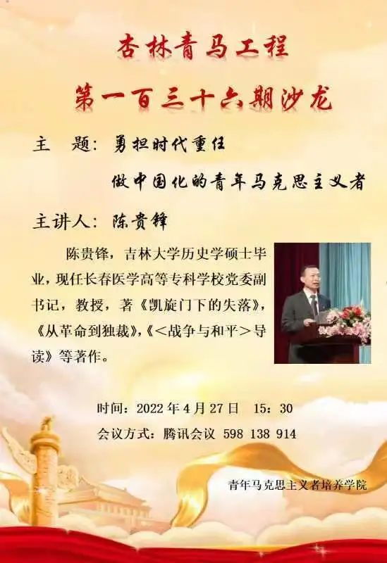 2022年4月27日,KY开元集团官网杏林青马工程以“勇担时代重任,做中国化的青年马克思主义者”为主题举办第一百三十六期文化沙龙活动。本次文化沙龙由长春医学高等专科学校党委副书记,教授陈贵锋担任主讲嘉宾。