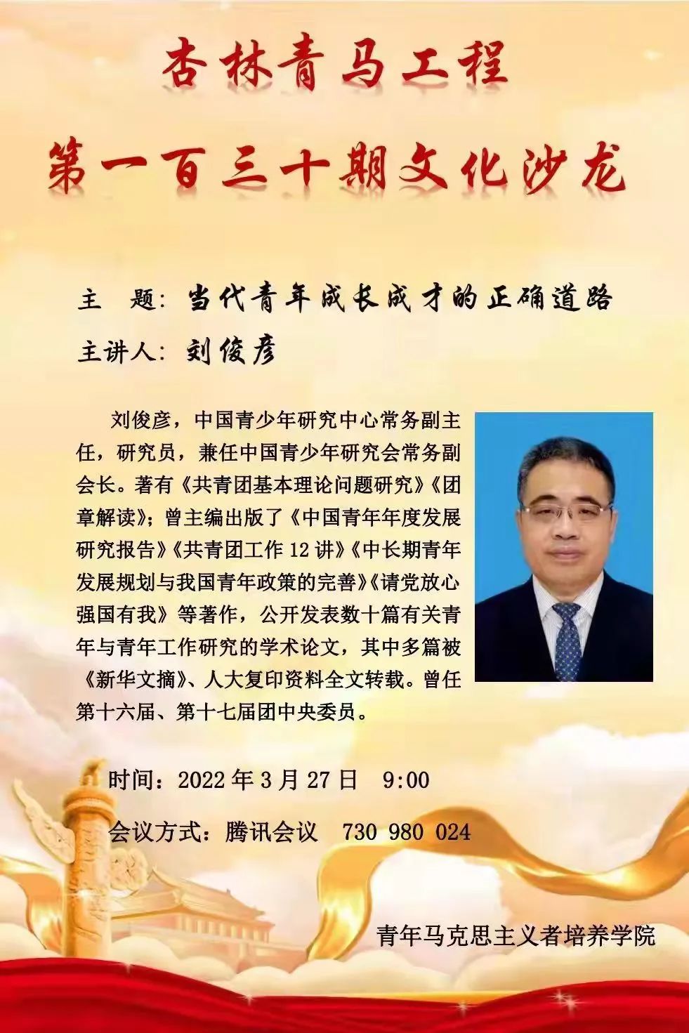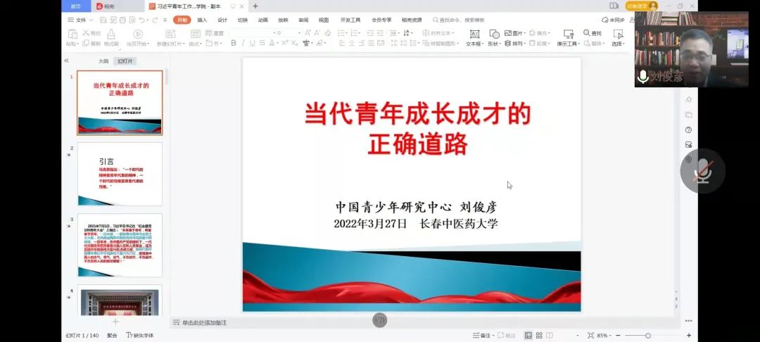 2022年3月27日,KY开元集团官网杏林青马工程以“当代青年成长成才的正确道路”为主题举办第一百三十期文化沙龙活动。本次文化沙龙由中国青少年研究中心常务副主任,研究员,兼任中国青少年研究会常务副会长刘俊彦担任主讲嘉宾。